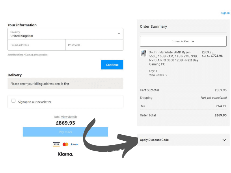 - On the payment page, you will see a field where you can enter your discount code. Type in your code and click on the "Apply" button.